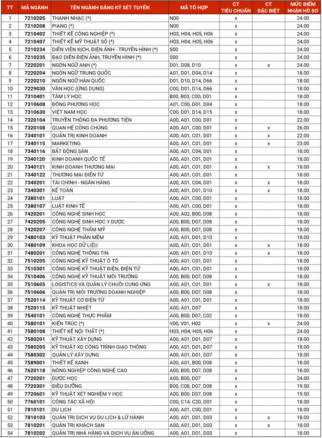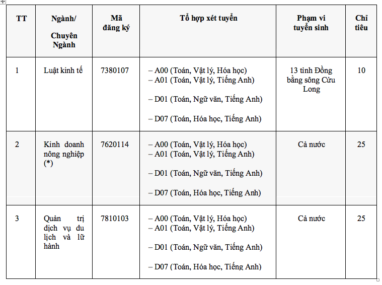 Cụ thể, ngành luật kinh tế xét 10 chỉ tiêu, ngành kinh doanh nông nghiệp 25 chỉ tiêu, quản trị dịch vụ du lịch và lữ hành 25 chỉ tiêu. Thông tin từng ngành như bảng sau: