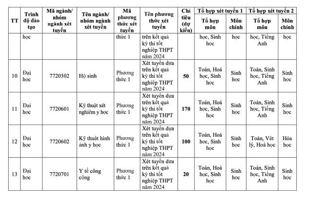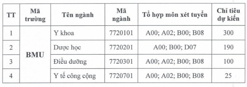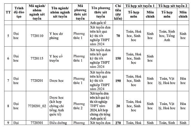 Chỉ tiêu dự kiến của nhà trường là 615 cho 4 ngành: Y khoa 300 chỉ tiêu, Dược học 190, Điều dưỡng 100 và Y tế công cộng 25.