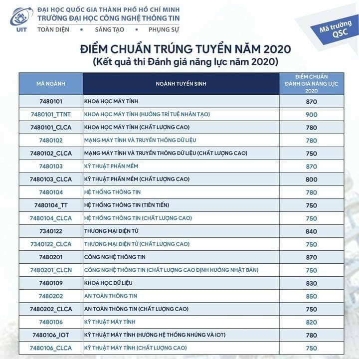 Đại học Công nghệ thông tin (Đại học Quốc gia TP HCM) công bố điểm chuẩn trúng tuyển bằng kết quả thi đánh giá năng lực.