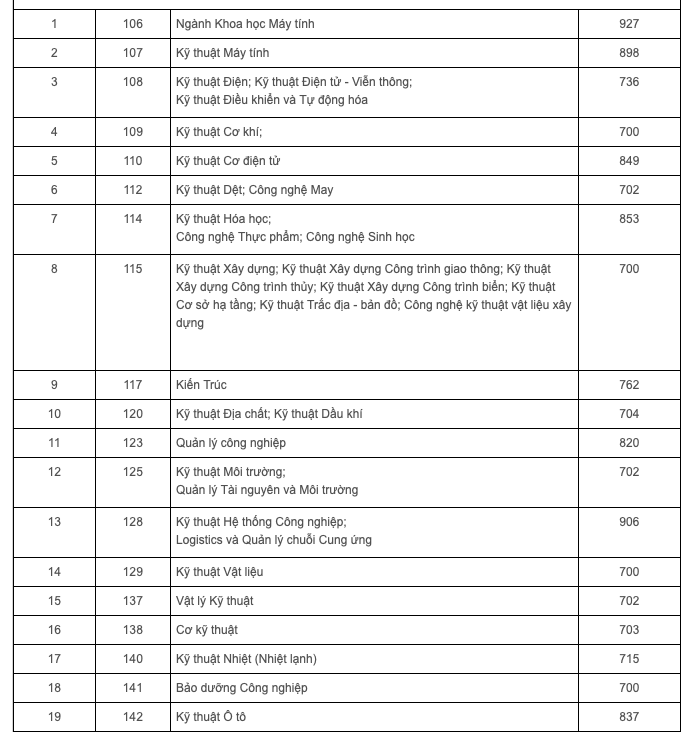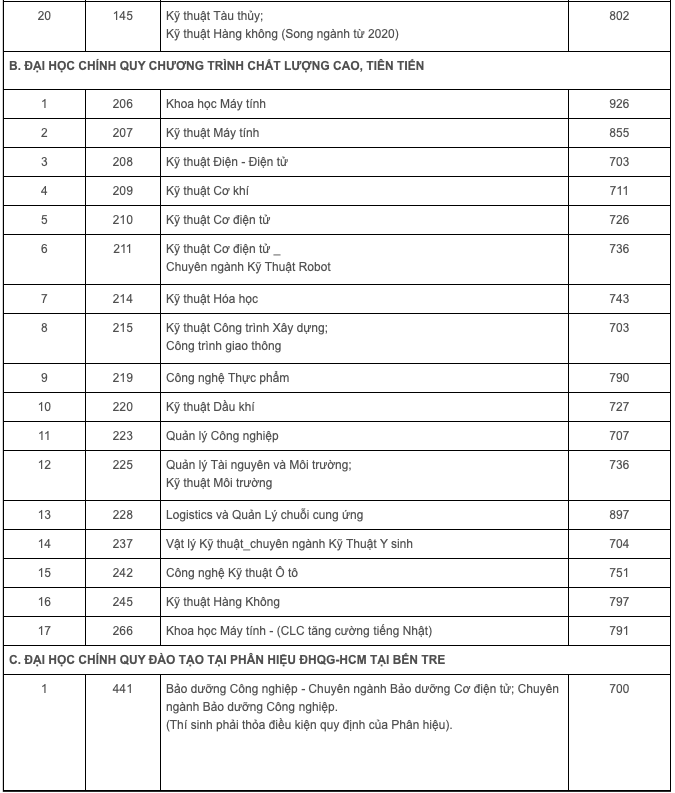Ngành có điểm chuẩn cao nhất là Khoa học máy tính chương trình tiên tiến với điểm chuẩn 903 điểm. Xếp sau là các chuyên ngành Máy tính và Công nghệ thông tin (880 điểm), Công nghệ sinh học (810 điểm)...