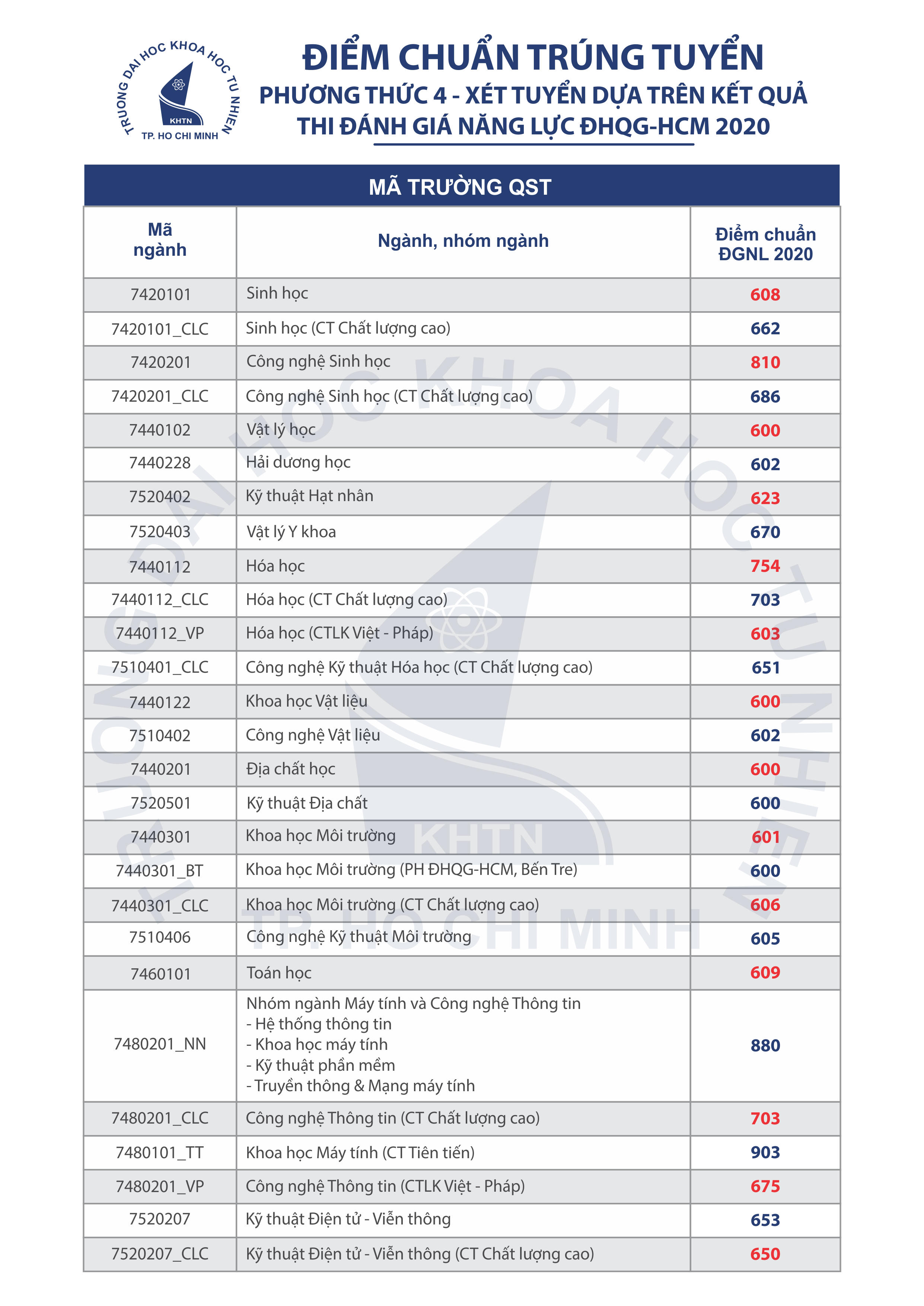 Trên web Trường Đại học Khoa học Tự nhiên - Đại học Quốc gia TP HCM vừa thông báo kết quả trúng tuyển vào đại học hệ chính quy dựa trên kết quả Kỳ thi Đánh giá năng lực do Đại học Quốc Gia TP HCM tổ chức năm 2020.