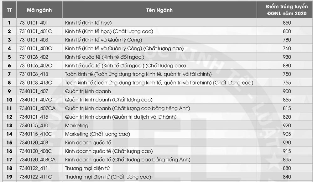 Một thành viên khác của Đại học Quốc gia TP HCM, trường Đại học Kinh tế - Luật, công bố điểm chuẩn với 2 ngành cao nhất là Kinh tế quốc tế (Kinh tế đối ngoại) và Kinh doanh quốc tế ở mức 930 điểm.