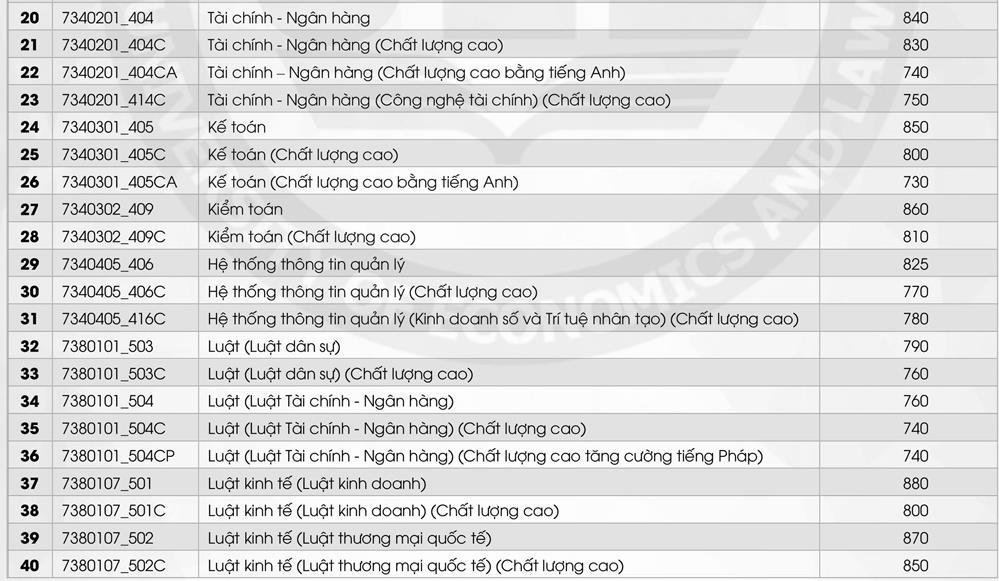 Chương trình có điểm trúng tuyển thấp nhất là Kế toán (chất lượng cao bằng tiếng Anh) với 730 điểm. Trong 40 chương trình đào tạo, 6 chương trình điểm trúng tuyển trên 900 điểm. Thí sinh xác nhận nhập học trực tiếp tại trường hoặc theo bưu điện trước ngày 10/9.