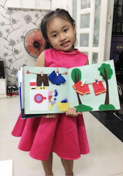 | Bé Cherry, con chị Vân Phương say mê với những món đồ chơi do tự tay mẹ làm để phát triển nhận thức, trí tưởng tượng của con. |