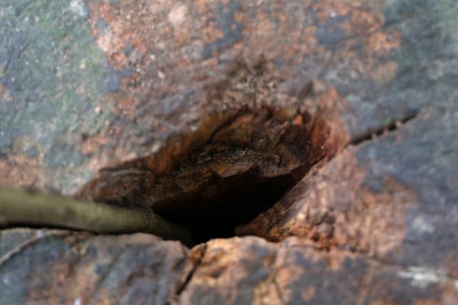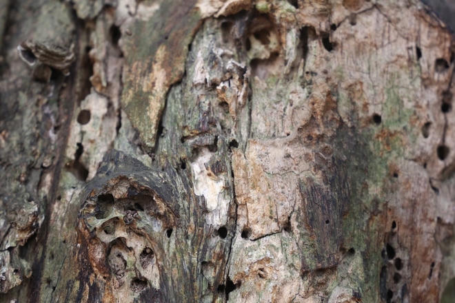 | Khi bị chặt, một bên thân không được xử lý tốt nên sâu bệnh phát triển khiến cây chết mòn. Trên mặt cắt có một lỗ rỗng sâu 1,4 m xuống tận gốc. |