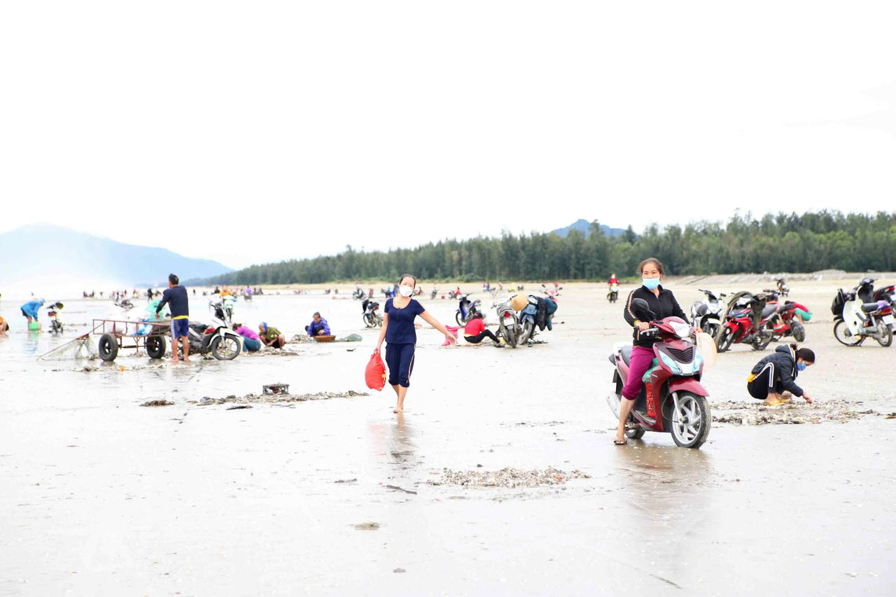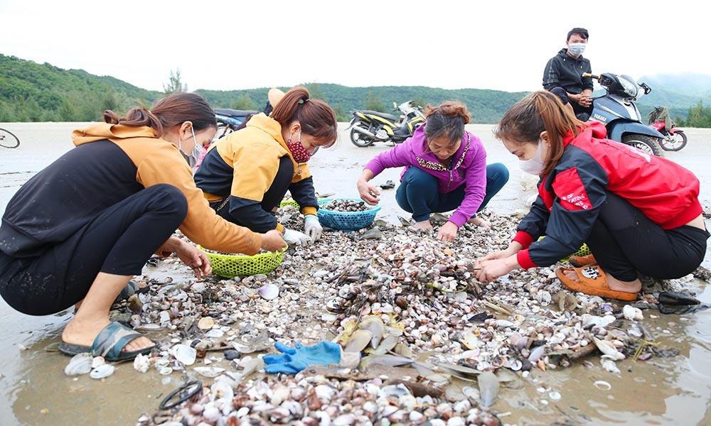 Sau mưa lũ, các loại sò lông, sò huyết,... dạt trắng bờ biển, chất thành từng đống. Hàng trăm người dân đổ ra biển vớt sò đưa đi bán, thu tiền triệu mỗi ngày.