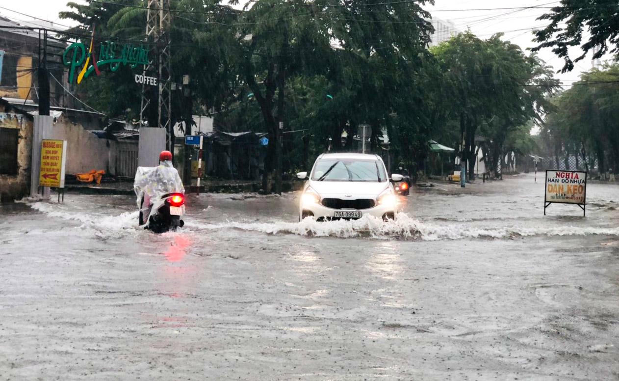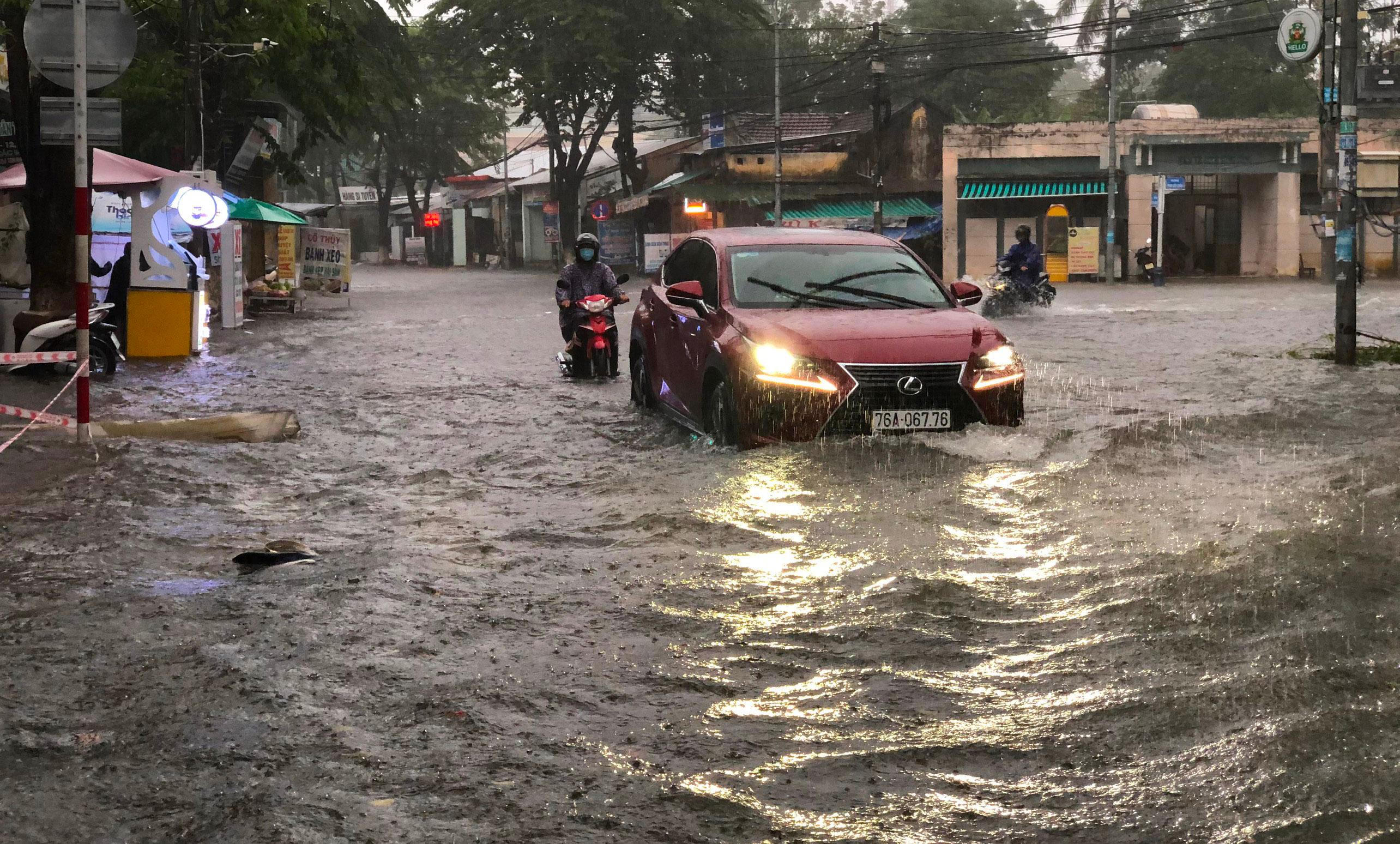 Chiều 23/9, mưa lớn kéo dài gần 3 giờ (từ 13h30 đến 16h) làm nhiều tuyến đường Quang Trung, Phan Đình Phùng, Trần Hưng Đạo, Phan Chu Trinh, Phan Bội Châu… ở thành phố Quảng Ngãi bị ngập sâu trong nước khiến người tham gia giao thông đi lại khó khăn.