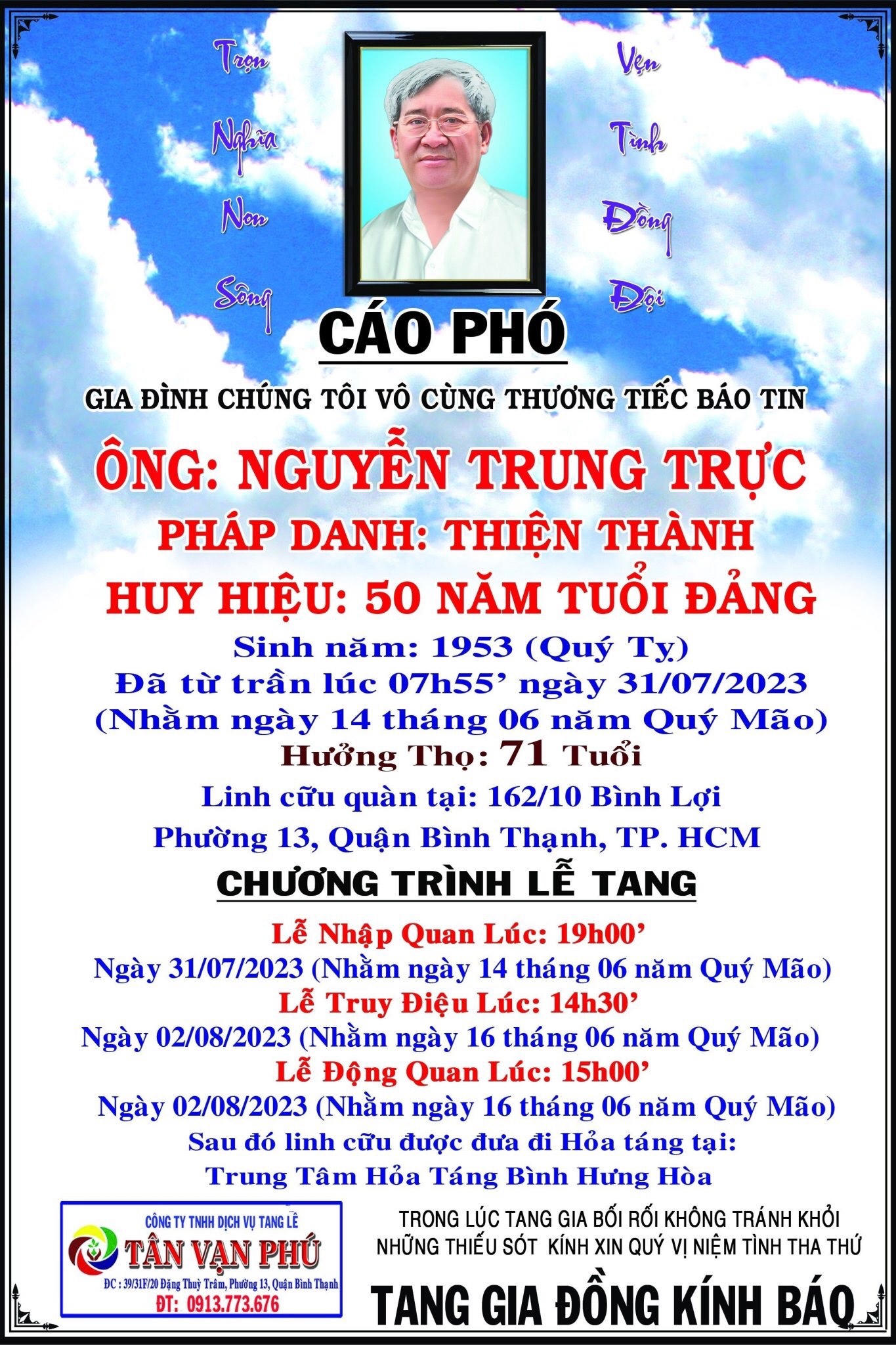 Cụ ông Nguyễn Trung Trực - pháp danh: Thiện thành (sinh năm: 1953 (Quý tỵ), nguyên là Thành ủy viên, nguyên Phó Trưởng ban Thường trực Ban Tuyên giáo Thành uỷ, nguyên Hiệu trưởng Trường Cán bộ Thành phố Hồ Chí Minh, nguyên Bí thư Quận uỷ Quận Bình Thạnh; Huy hiệu 50 năm tuổi Đảng; Cụ đã từ trần vào lúc 07h55 ngày 31/07/2023 (tức ngày 14/06/2023 âm lịch). Hưởng thọ: 71 tuổi. Linh cữu quàn tại: 162/10 Bình Lợi phường 13, Quận Bình Thạnh, TP. HCM.