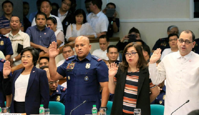 Cảnh sát trưởng Philippines Ronald dela Rosa (thứ 2 từ trái qua) tuyên thệ trước điều trần tại Thượng viện ngày 22/8. |