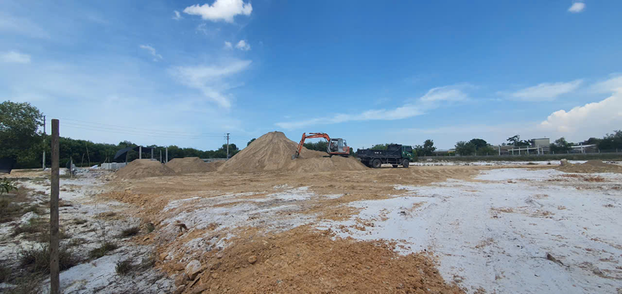 Cụ thể, bãi tập kết cát trái này nằm sát đường DT9. Phía bên ngoài, chủ đất đang cho xây dựng tường rào bê-tông cao. Bên trong, ngoài một khối lượng lớn cát vàng được tập kết, là khu vực cát trắng đã bị đào xới thành ao nước. Xung quanh bãi tập kết cát là đủ phương tiện dùng cho việc vận chuyển, đổ cát như: máy ủi, máy múc, xe tải. Hằng ngày, nhiều lượt xe trọng tải lớn chở cát về tập kết và vận chuyển đi đã ảnh hưởng một phần không nhỏ đến giao thông đi lại trên tuyến đường bê- tông nhỏ chạy xuyên vùng rú cát.