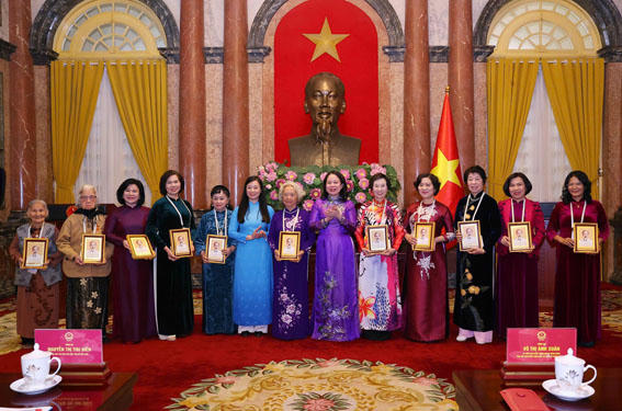 Phó Chủ tịch nước Võ Thị Ánh Xuân tặng quà lưu niệm cho các nữ đảng viên tiêu biểu Thủ đô (bà Bùi Thị An đứng thứ năm từ phải qua). (Ảnh: Hội LHPN Hà Nội) |