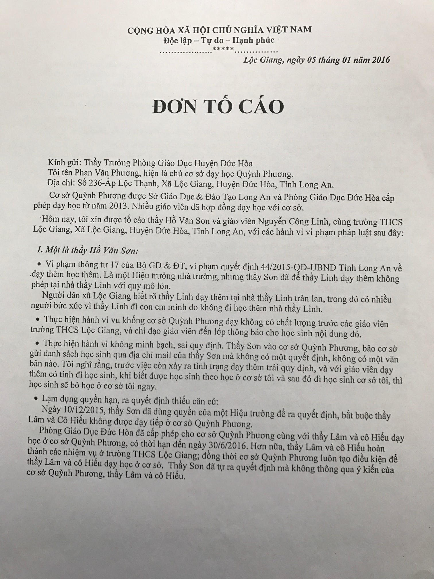 Tuy nhiên, theo ông Phương, thông báo thụ lý tố cáo 1225/TB-UBND ngày 10/3/2017 của UBND huyện Đức Hoà sai lệch nội dung và người bị tố cáo. Cụ thể như, không đề cập đến nội dung thầy Sơn vu khống; thầy Linh dạy thêm không phép, trù dập học sinh và vu khống.