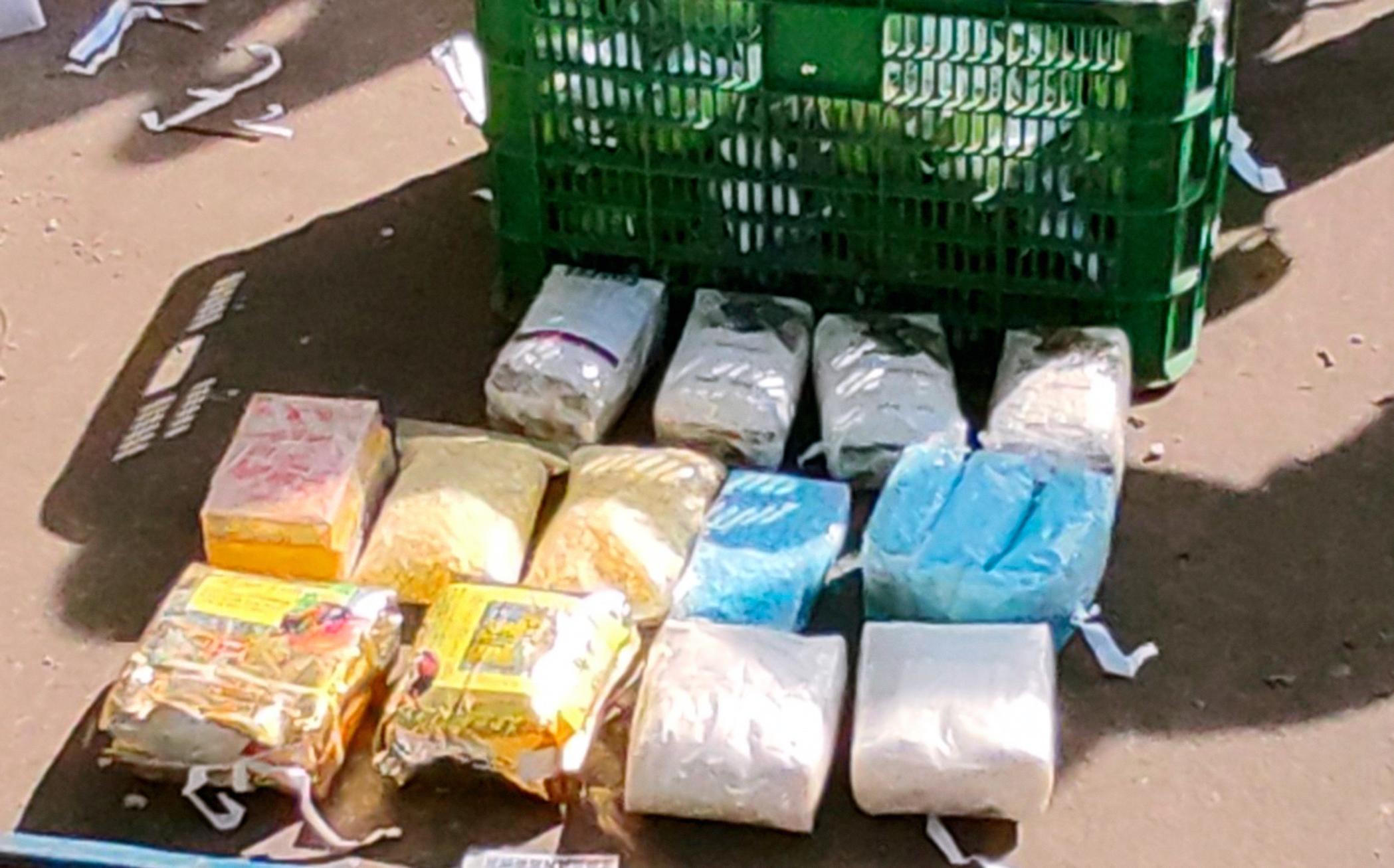 Tại đây, qua kiểm tra, cơ quan chức năng phát hiện trên xe chở xoài có 30 bánh màu vàng, 3 túi trà bên ngoài có in chữ Trung Quốc; 7 túi nylon màu trắng; 4 túi nylon khác đựng những viên nén màu xanh, vàng và 1 bịch khác màu vàng. Tổng trọng lượng khoảng 24 kg.