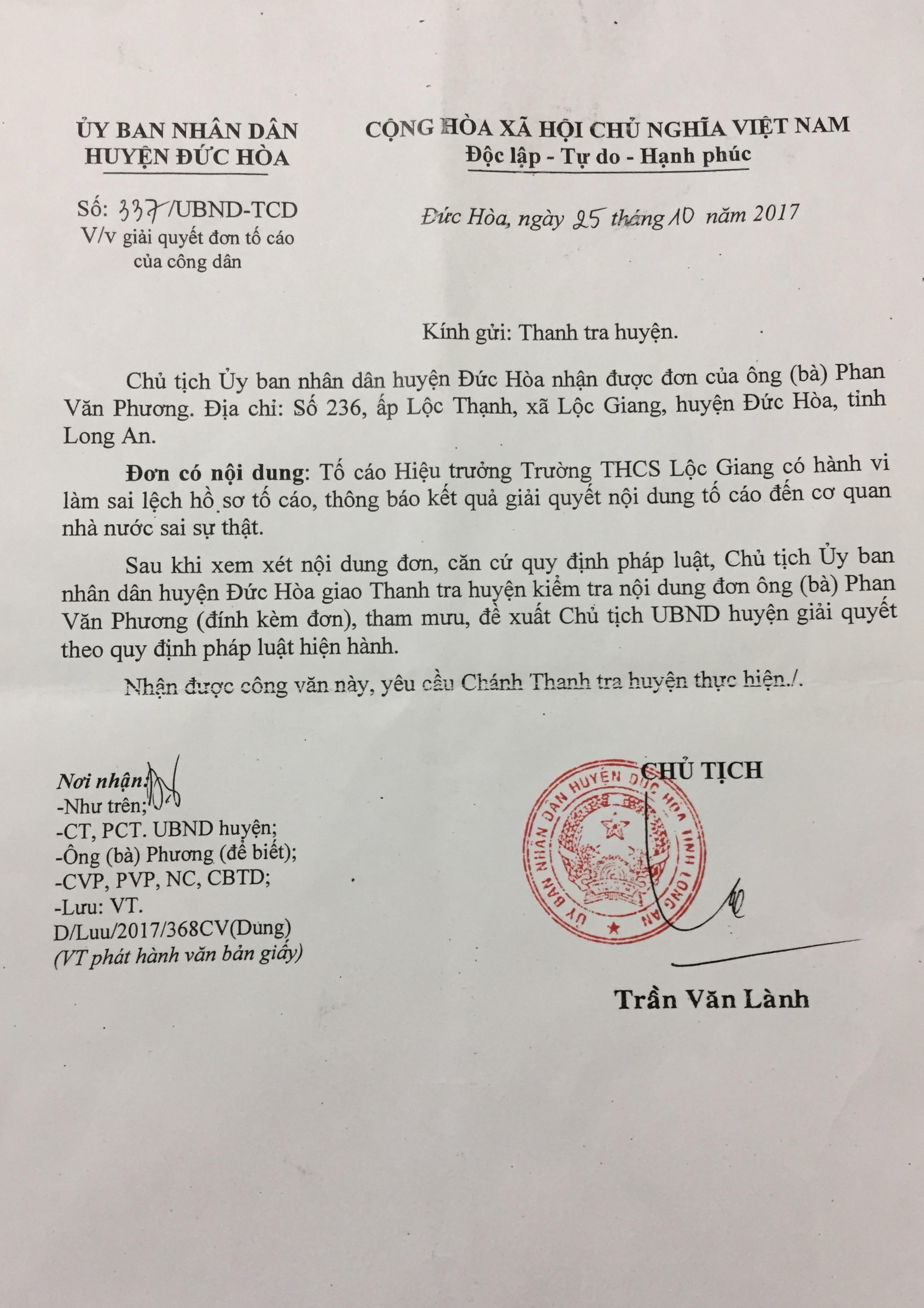 Không đồng tình với việc làm của lãnh đạo Phòng GD&ĐT, ông Phương gửi đơn đến Chủ tịch UBND huyện Đức Hòa, tố cáo ông Lê Văn Hải làm trái quy định của Bộ GD&ĐT, phản ánh sự thiếu trách nhiệm của lãnh đạo phòng GD&ĐT.