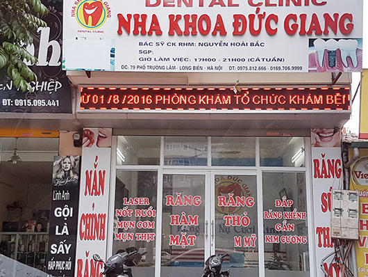 | Cơ sở nha khoa Minh Đức nằm trên phố Việt Hưng, quận Long Biên không ghi số giấy phép trên biển quảng cáo. |