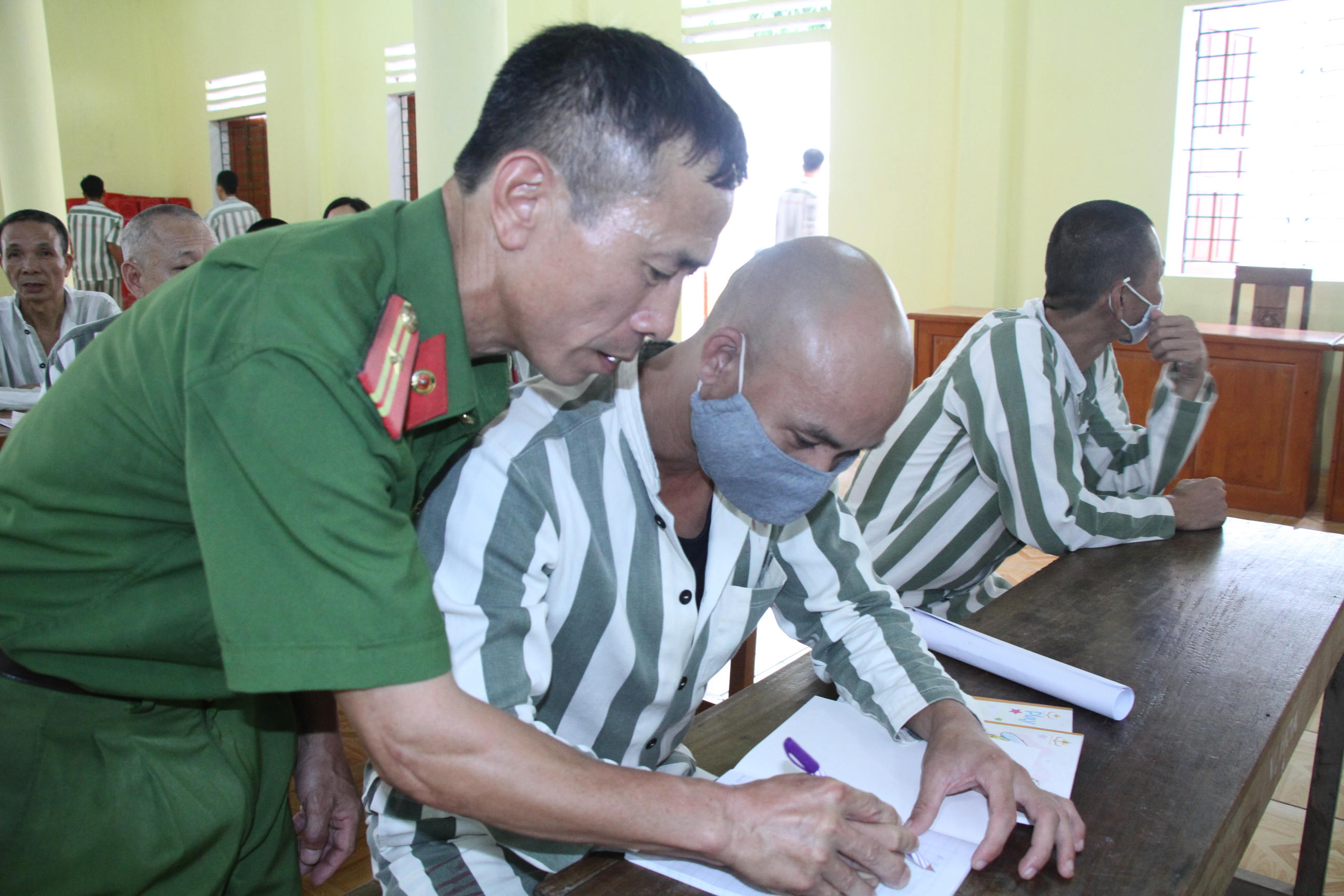 Cầm quyển vở còn thơm mùi giấy, các học viên mang áo số bắt đầu giờ học, trên bục giảng, Thiếu tá Nguyễn Bá Đường, cán bộ Đội giáo dục hồ sơ, Trại giam số 3, nắn nót ghi những chữ cái. Dưới lớp, các học viên chăm chú nhìn từng nét phấn của thầy rồi lóng ngóng tập viết vào vở.