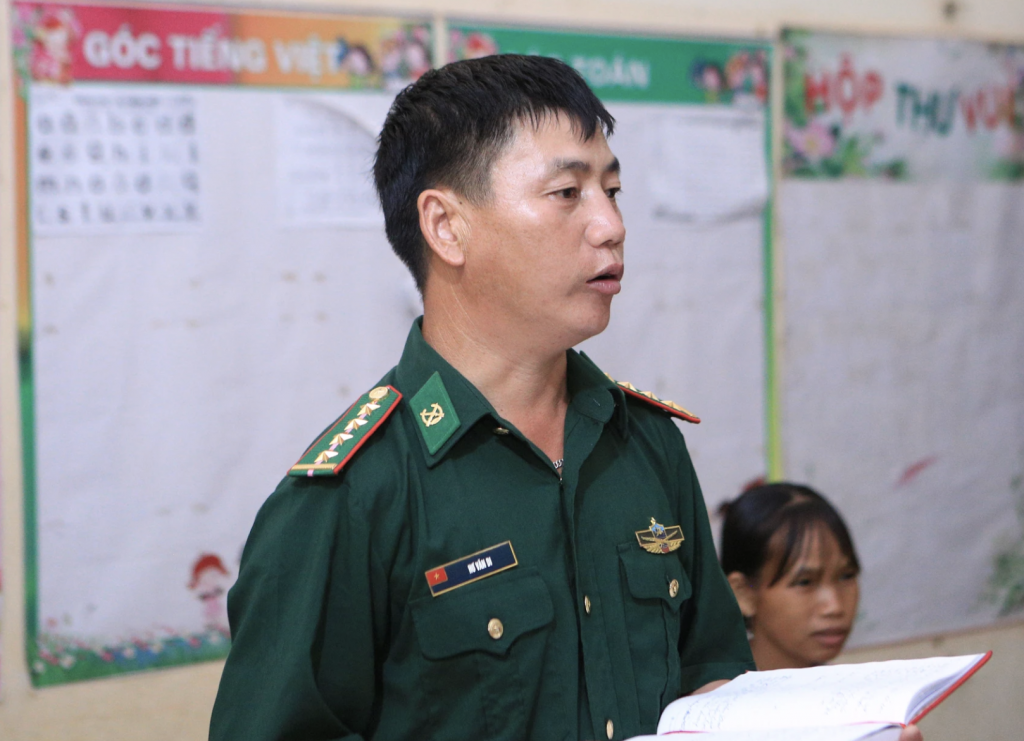 Thầy giáo quân hàm xanh Hơ Văn Di, với phong thái điềm đạm, đến bên cạnh từng học viên để giảng bài một cách tận tình, chi tiết. Vốn quanh năm chỉ quen cầm dao, cầm cuốc, bàn tay chai sần, thô ráp, nay cầm bút thấy gượng gạo, cố gắng uốn nắn theo từng nét chữ. Phải cầm vào những bàn tay chai sần vì lao động, hướng dẫn di theo từng nét chữ, nhắc đi nhắc lại nhiều lần, anh không chỉ dạy mà còn phải cùng đồng bào khắc phục cả sự ngượng ngùng, tự ti… Do vậy, dù rất hăng hái học tập nhưng mức độ tiếp nhận của mỗi người mỗi khác, nên các anh phải vô cùng nhẫn nại và linh hoạt với nhiều phương pháp giảng dạy thì mới xóa bỏ được tự ti để lớp học thực sự hiệu quả.