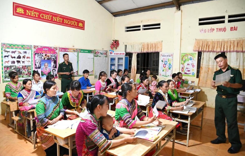 Chị Thào Thị Xay, học viên lớp xóa mù bản Khằm 2, xã Trung Lý, huyện Mường Lát cho biết: “Trước đây thì phụ nữ bản Khằm 2 chúng ta không biết chữ, được thầy Di biên phòng dạy cho chị em chúng ta biết chữ, biết viết tên mình, biết đi làm công ty kiếm tiền nuôi gia đình, cho các con đi học, không nghe theo cái xấu…”.