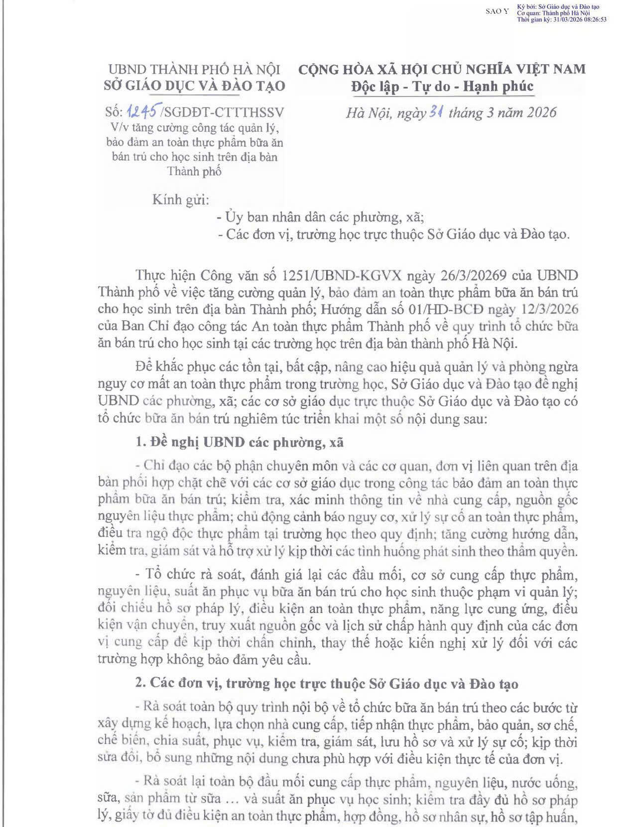 Trước thực trạng đó, Sở Giáo dục và Đào tạo Hà Nội có văn bản số 1245/SGD ĐT-CTTTHSSV ngày 31/3 gửi Ủy ban Nhân dân các phường, xã và các đơn vị, trường học trực thuộc Sở tăng cường công tác quản lý, bảo đảm an toàn thực phẩm bữa ăn bán trú cho học sinh trên địa bàn thành phố.