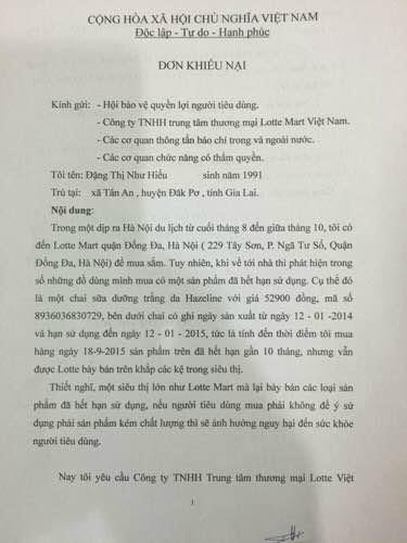 Cụ thể, chị Hiếu cho biết, trong đợt đi du lịch tại Hà Nội từ cuối tháng 8 đến giữa tháng 10 vừa qua, chị Hiếu có đến siêu thị Lotte ở đường Tây Sơn, quận Đống Đa, Hà Nội để mua hàng. Trong đó, chị Hiếu có mua mặt hàng sữa dưỡng trắng da Hazeline với giá 52.900 đồng.