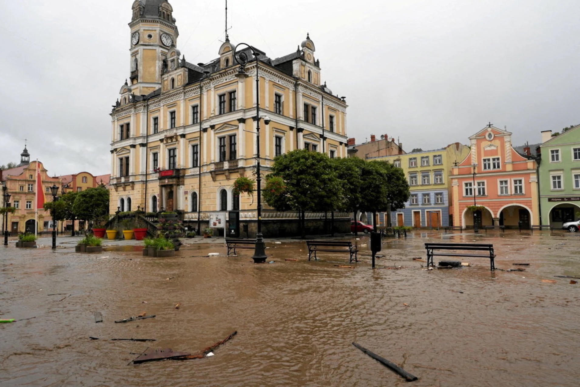 | Nước lũ dâng lên gần tòa thị chính khi nước sông Biala Ladecka tràn vào Ladek-Zdroj, hạt Klodzko (powiat Klodzki), Ba Lan. Ảnh: Tomasz Pietrzyk/ REUTERS |