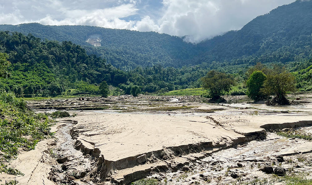 Bùn đất từ trên núi đổ về bản sau mưa lũ |