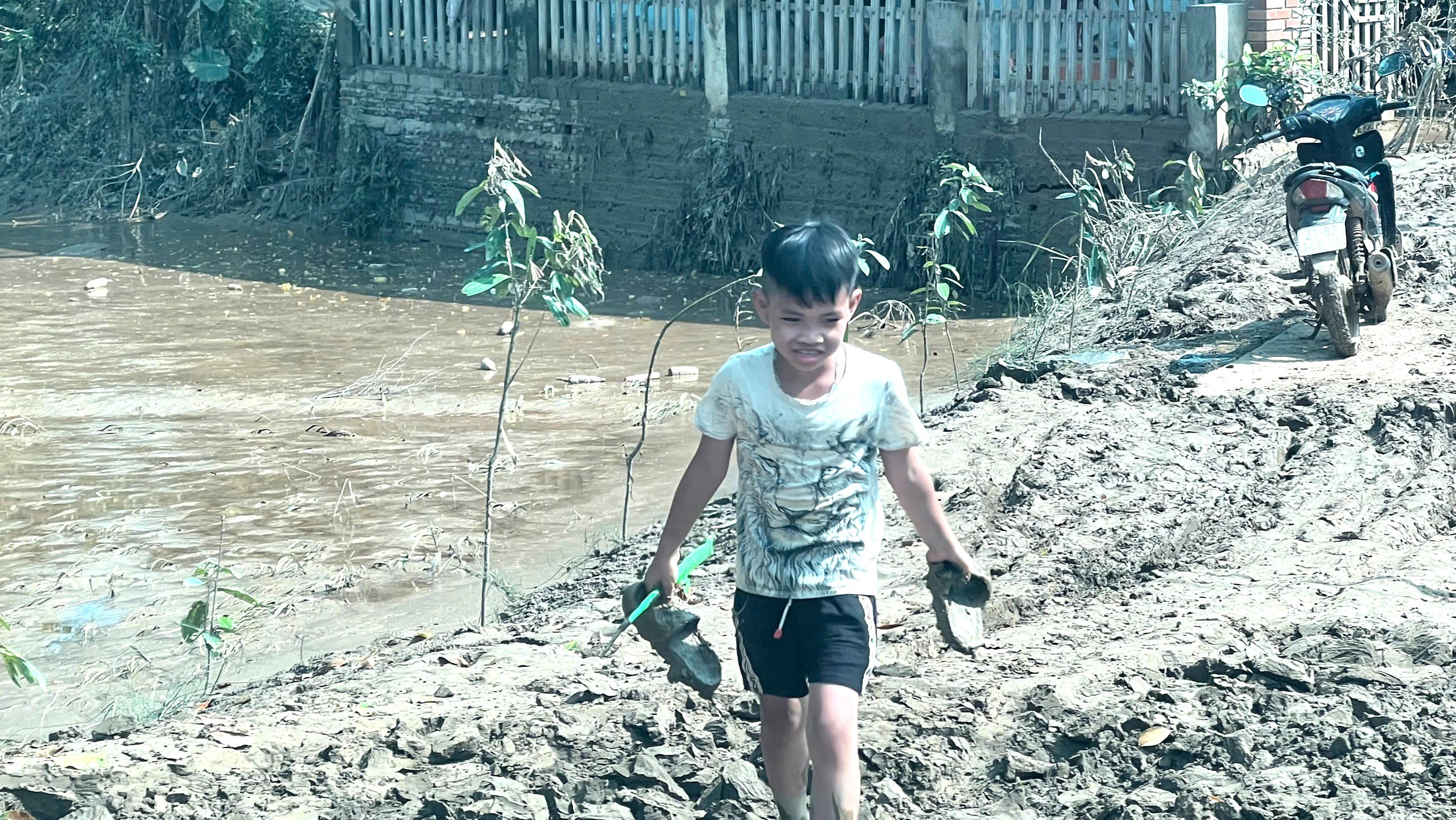 Bùn đất hậu mưa lũ là thử thách lớn với người dân Trấn Yên. Ảnh: Xuân Hồng. |
