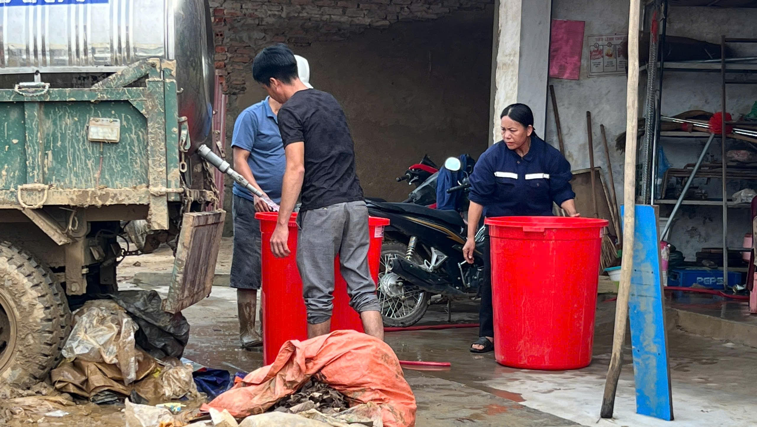 Người dân huyện Trấn Yên chia nhau nước sạch sau khi lũ rút. Ảnh: Xuân Hồng. |