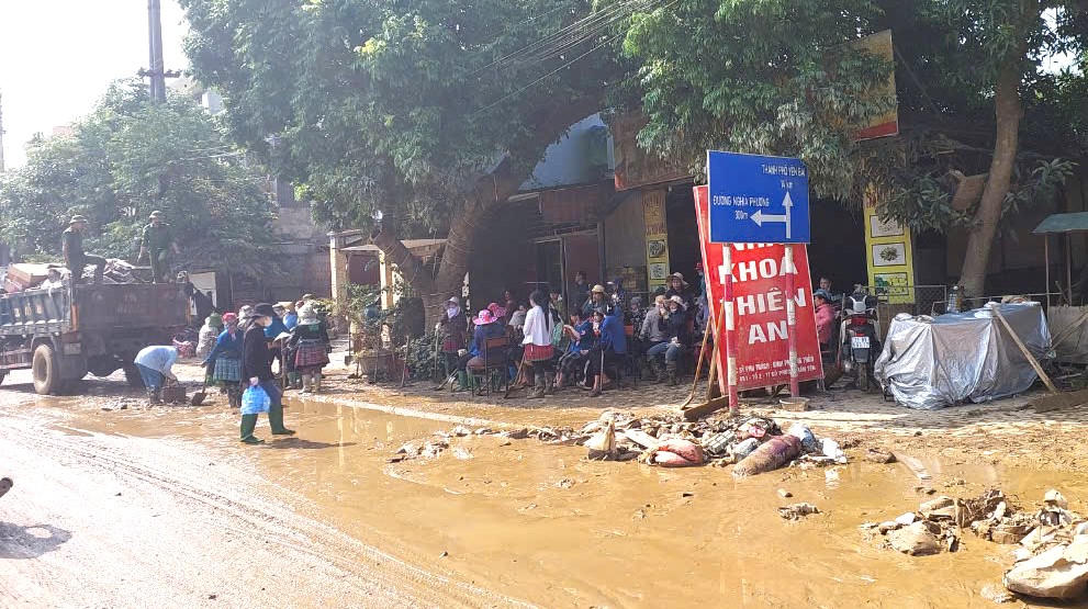 Công tác khắc phục sau mưa lũ thực hiện nhịp nhàng, khẩn trương, đông đảo tình nguyện viên từ huyện Trạm Tấu và nhiều nơi khác đã đến "chung lưng đấu cật" cùng người dân địa phương dọn rác dẹp bùn.