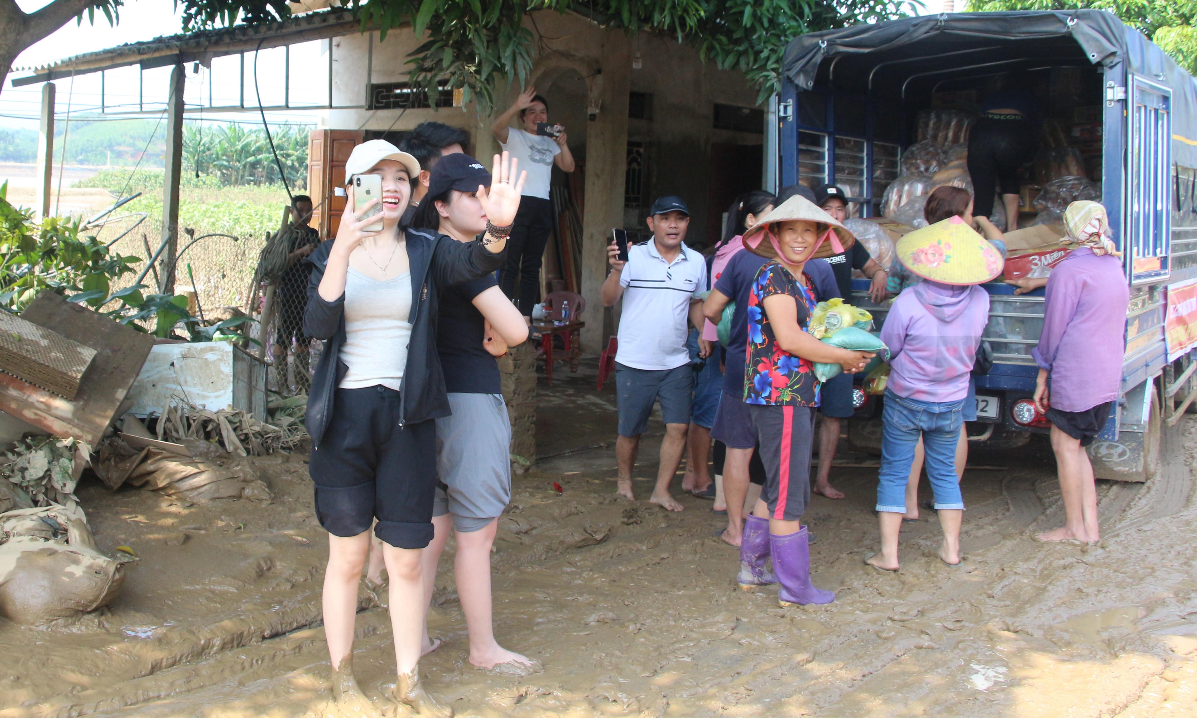 Một nhóm thiện nguyện đến từ Hà Tĩnh đang phân phát quà hỗ trợ người dân Trấn Yên vượt lũ. Ảnh: Đức Tuyển. |