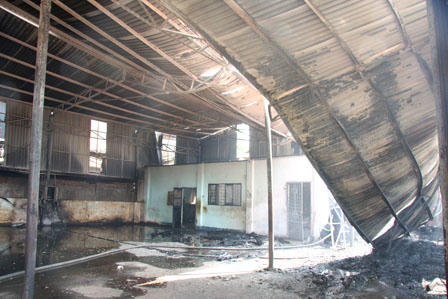 Tại hiện trường, mái tôn và tường bê tông đổ sập. Máy móc, nguyên phụ liệu bên trong cháy đen, hư hỏng nghiêm trọng. Kho xưởng rộng hơn ngàn mét bị thiêu cháy. Hàng chục công nhân hoảng loạn. May mắn không có thương vong về người.