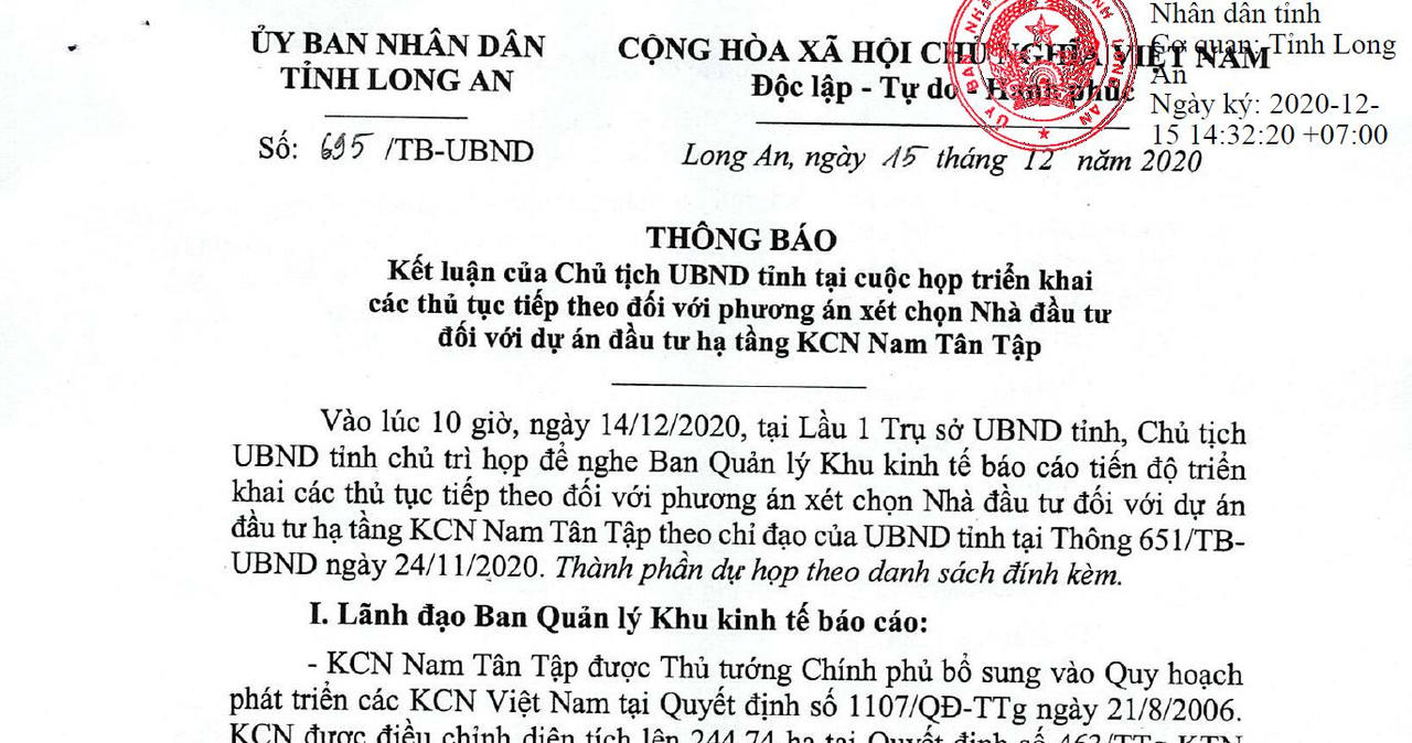 Trước khi UBND Long An ra ý kiến quyết định ngày 14/12/2020, qua rà soát, nhận thấy tại thời điểm đăng ký đầu tư, chỉ duy nhất liên danh Cty CP Công nghệ Viễn thông Sài Gòn và Cty CP Khu công nghiệp Sài Gòn - Hải Phòng nộp hồ sơ đề nghị chấp thuận chủ trương đầu tư kịp thời đầy đủ đến BQLKKT. Các DN còn lại trước đó chỉ có “văn bản xin chủ trương”.