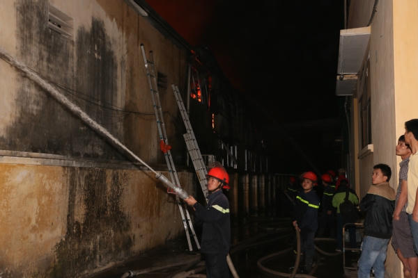 | Lực lượng cứu hỏa tìm cách tiếp cận bên trong nhà xưởng để dập lửa. Cảnh sát dùng thang để lên vị trí cao, phun nước vào bên trong. |