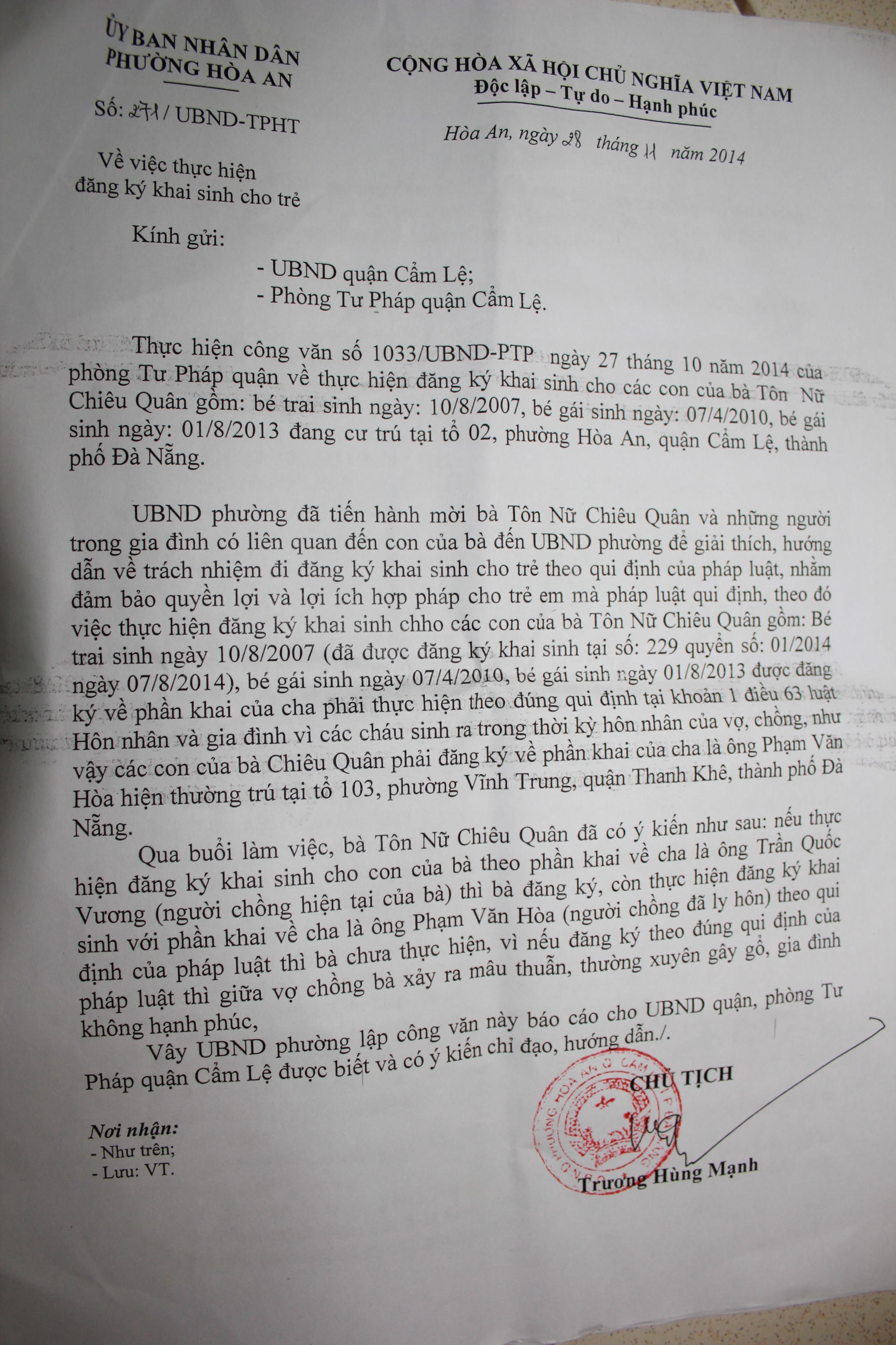 Từ cơ sở này, UBND phường có tờ trình gửi Sở Tư pháp TP Đà Nẵng, UBND quận và Phòng Tư pháp quận, đề nghị cho phép phường làm đăng ký khai sinh cho các cháu theo đúng tên cha mẹ đẻ.