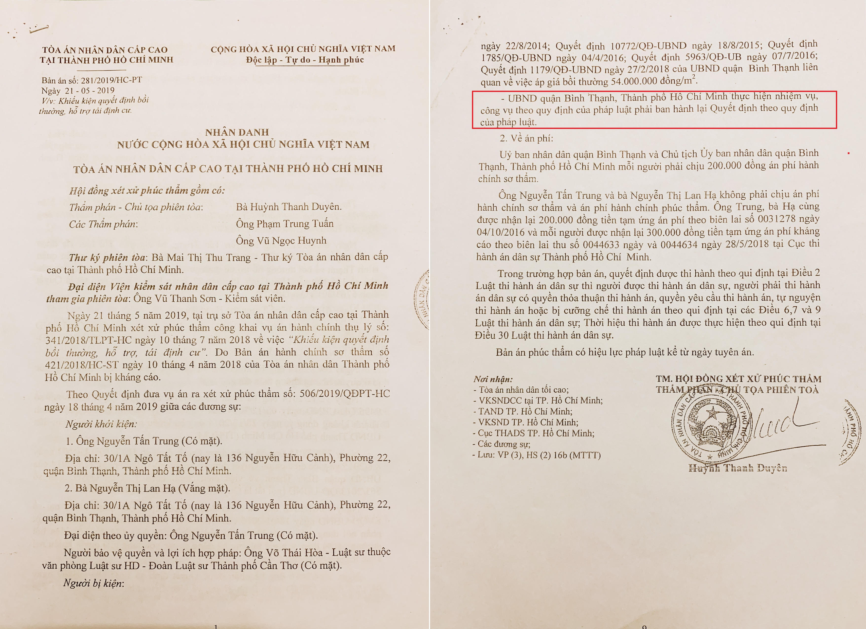 Theo bản án số 281/2019/HC-PT ngày 21/5/2019, TAND Cấp cao tại TP HCM đã quyết định chấp nhận yêu cầu khởi kiện của ông Nguyễn Tấn Trung và bà Nguyễn Thị Lan Hạ hủy một phần Quyết định số 5763/QĐ-UBND ngày 05/6/2013 của UBND quận Bình Thạnh về việc áp giá bồi thường 54 triệu đồng/m2 đối với phần diện tích đất của ông bà bị thu hồi để giao cho Công ty Thanh niên xung phong đầu tư xây dựng Khu nhà ở cao tầng tại phường 22, quận Bình Thạnh.