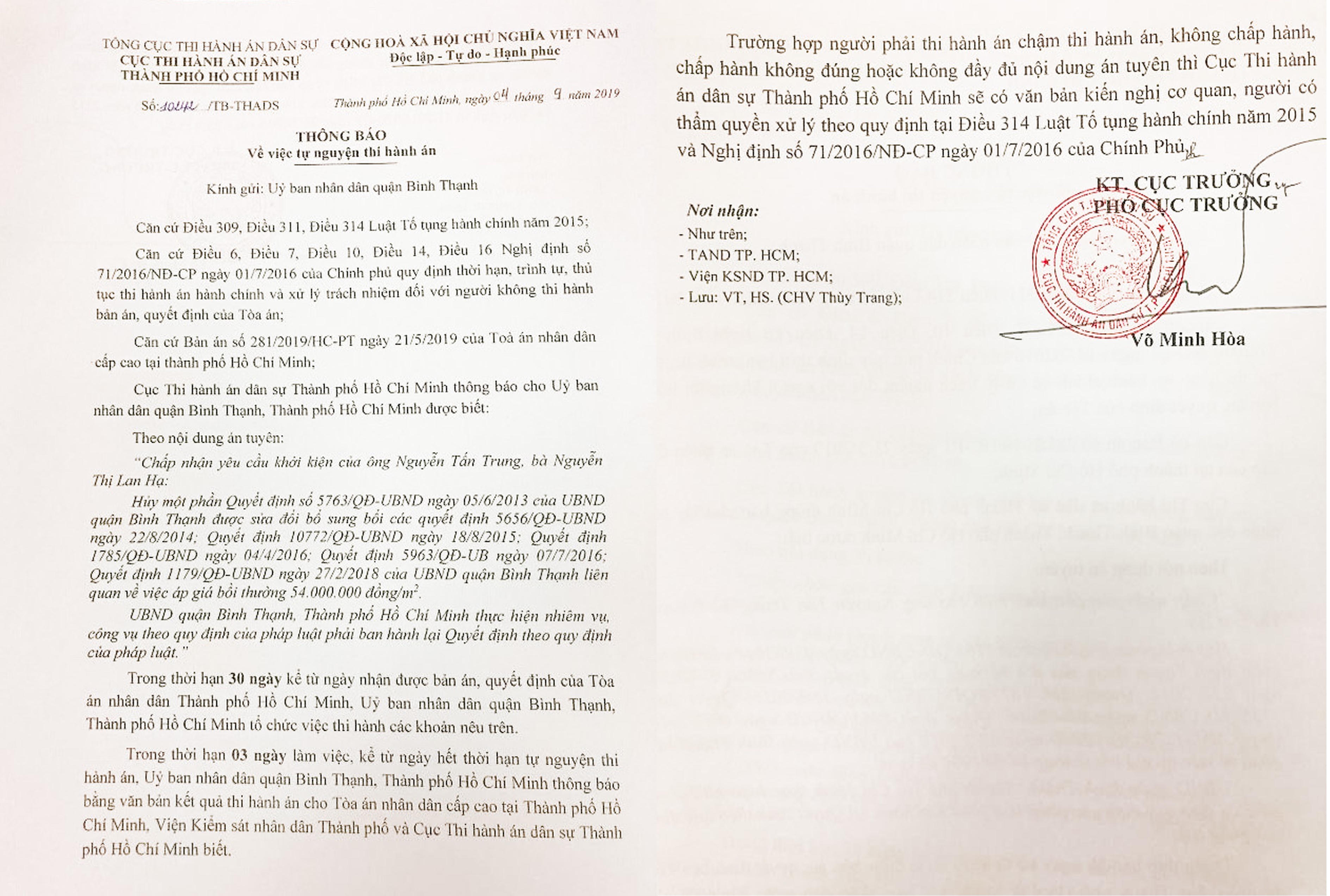 Sau khi bản án có hiệu lực, ngày 04/9/2019, Cục Thi hành án dân sự TP HCM ra văn bản thông báo số 10242/TB-THADS về việc tự nguyện thi hành án gửi cho UBND quận Bình Thạnh nêu rõ, trong thời hạn 30 ngày kể từ ngày nhận được bản án, quyết định của TAND Cấp cao tại TP HCM, UBND quận Bình Thạnh phải tổ chức thi hành các điều khoản nêu trong bản án.