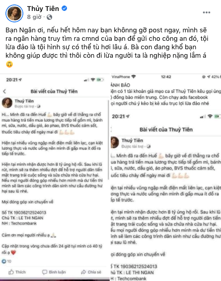 Ca sỹ Thủy Tiên đã kêu gọi được hơn 60 tỷ đồng và có mặt trực tiếp ở miền Trung để hỗ trợ bà con bị ngập lũ. Thế nhưng, lợi dụng uy tín của cô, một đối tượng đã mạo danh, mượn việc cô đang làm từ thiện để trục lợi. Cụ thể, người này sử dụng một tài khoản Facebook có tên Thủy Tiên, sử dụng ảnh đại diện và sao chép nội dung các bài đăng y hệt tài khoản của nữ ca sỹ. Sau đó, đối tượng này liên tục đăng tải những dòng trạng thái cập nhật về tình trạng mưa lũ ở Huế. Cuối bài viết, người này kêu gọi mọi người quyên góp để hỗ trợ người dân trang trải cuộc sống, sửa chữa nhà cửa, các công trình cầu đường sau lũ nhưng số tài khoản thụ hưởng lại là Lê Thị Ngân.