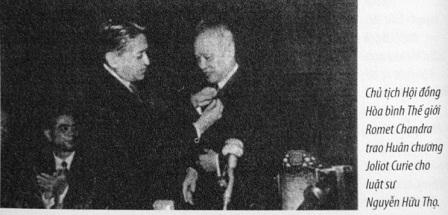 Chủ tịch Hội đồng Hòa bình thế giới Romet Chandra trao Huân chương Joliot Curie cho Luật sư Nguyễn Hữu Thọ |