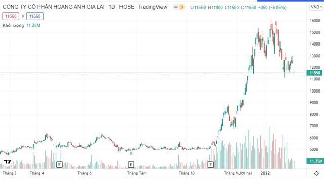 Cổ phiếu HAG ghi nhận mức giá thấp nhất trong năm 2021 khoảng 4.200 đồng và từ đó tăng mạnh đạt mức giá 15.650 đồng ở phiên ngày 17/1/2022. Số lượng thanh khoản rất cao ở mức vài chục triệu cổ phiếu mỗi phiên trong một thời gian dài. Tuy nhiên thời gian gần đây HAG bị rơi vào nhóm bị nhà đầu tư bán mạnh. Tính đến hết phiên giao dịch ngày 14/2/2022, cổ phiếu này giảm sàn về mức 11.550 đồng và dư bán hơn 16 triệu cổ phiếu trong tình trạng trắng bên mua.
