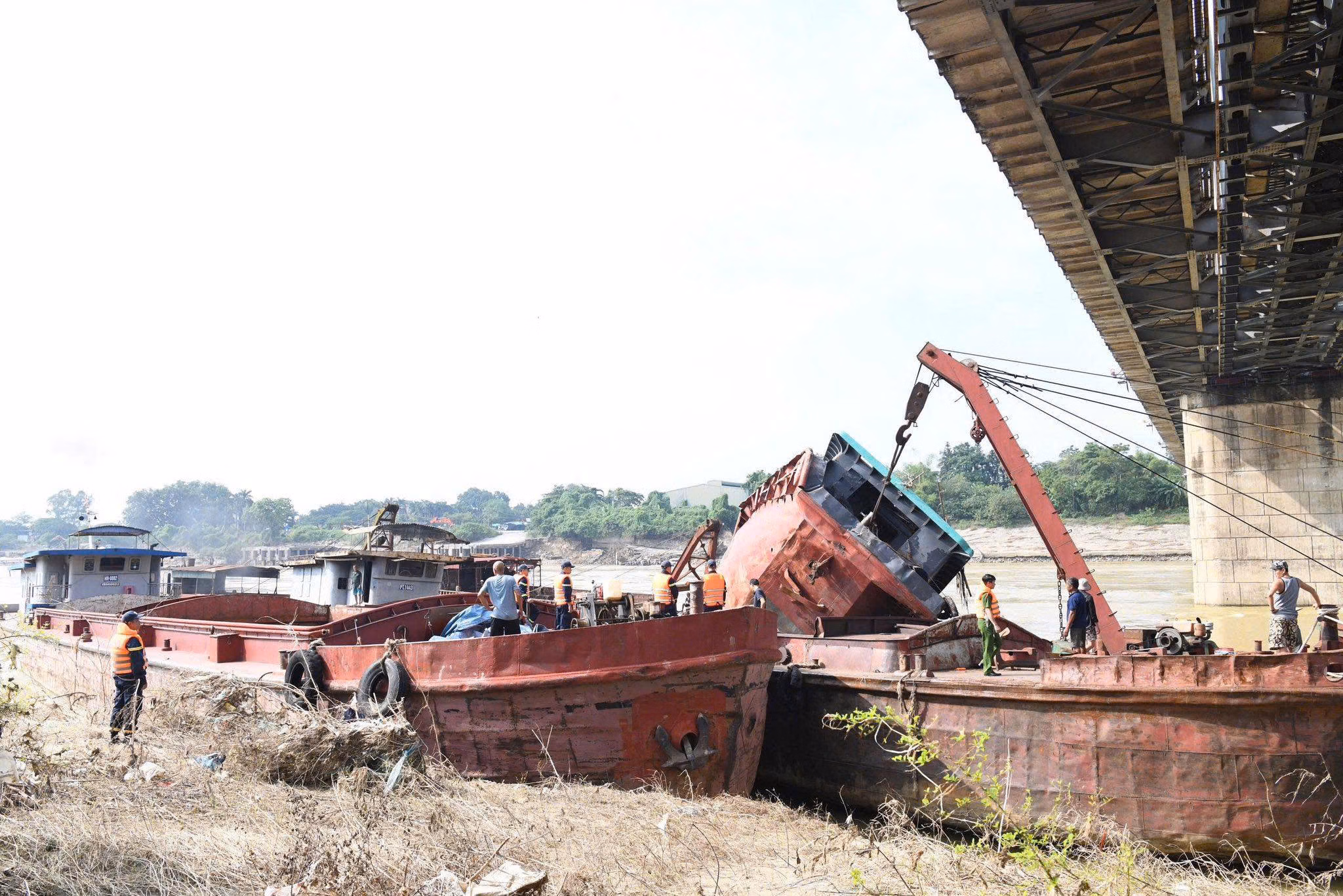 Lực lượng chức năng trục vớt tàu cát bị đắm trên sông Lô