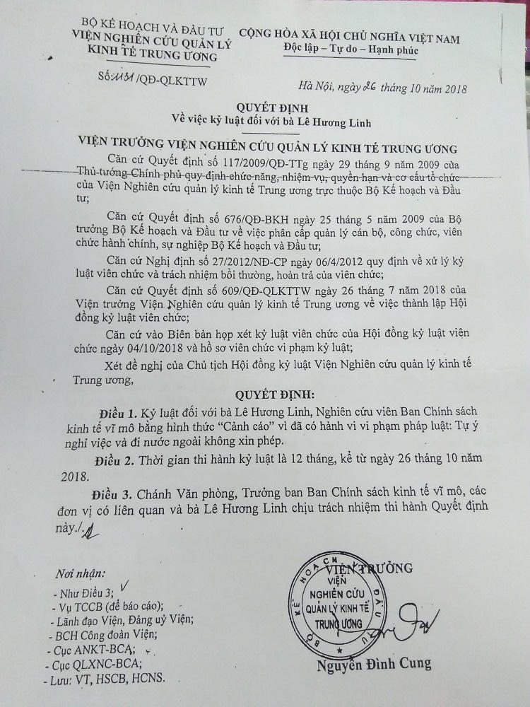 Đến ngày 26/10/2018, Viện NCQLKTTƯ ban hành Quyết định kỷ luật bà Linh bằng hình thức “Cảnh cáo” vì đã có hành vi tự ý nghỉ việc và đi nước ngoài không xin phép, thời gian thi hành kỷ luật 12 tháng. Không đồng ý, bà Linh khiếu nại. Viện ra thông báo về giải quyết khiếu nại. Bà Linh tiếp tục gửi đơn khiếu nại lên Bộ KH&ĐT nhưng bị từ chối giải quyết với lý do quá thời hiệu. Bà Linh đã thông qua luật sư gửi văn bản chỉ ra việc cơ quan nơi bà làm việc ra thông báo mà không ban hành Quyết định giải quyết khiếu nại lần đầu là trái luật, làm ảnh hưởng đến quyền lợi người lao động.