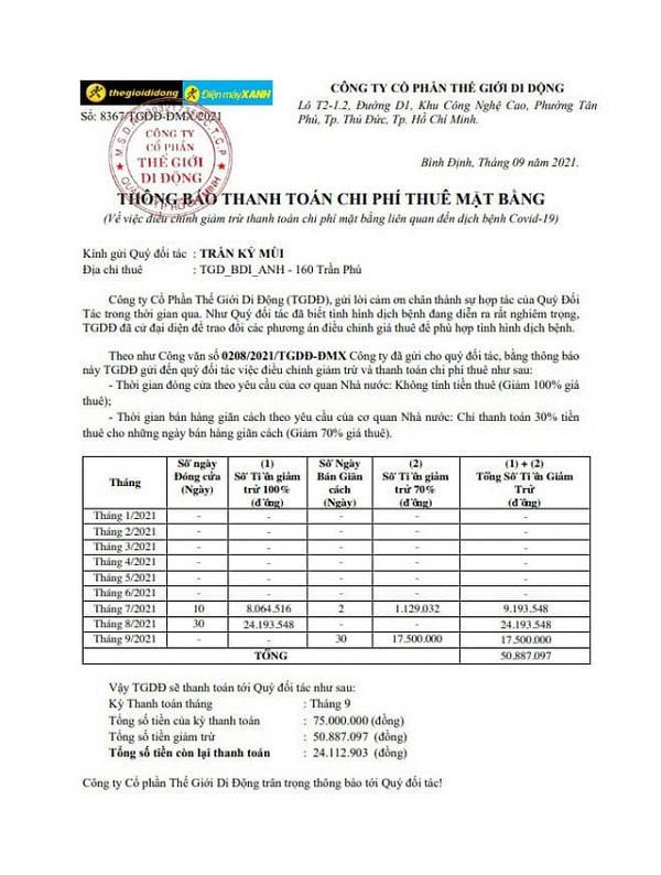 Mới đây trên mạng xã hội chia sẻ hình ảnh một văn bản của Công ty Cổ phần Đầu tư Thế giới Di động gửi đến các đối tác mặt bằng về việc thanh toán tiền thuê mặt bằng trong giai đoạn cửa hàng tạm đóng cửa do ảnh hưởng dịch Covid-19, do ông Quách Vĩnh Nam - Giám đốc bán hàng toàn quốc ký ngày 2/8/2021.