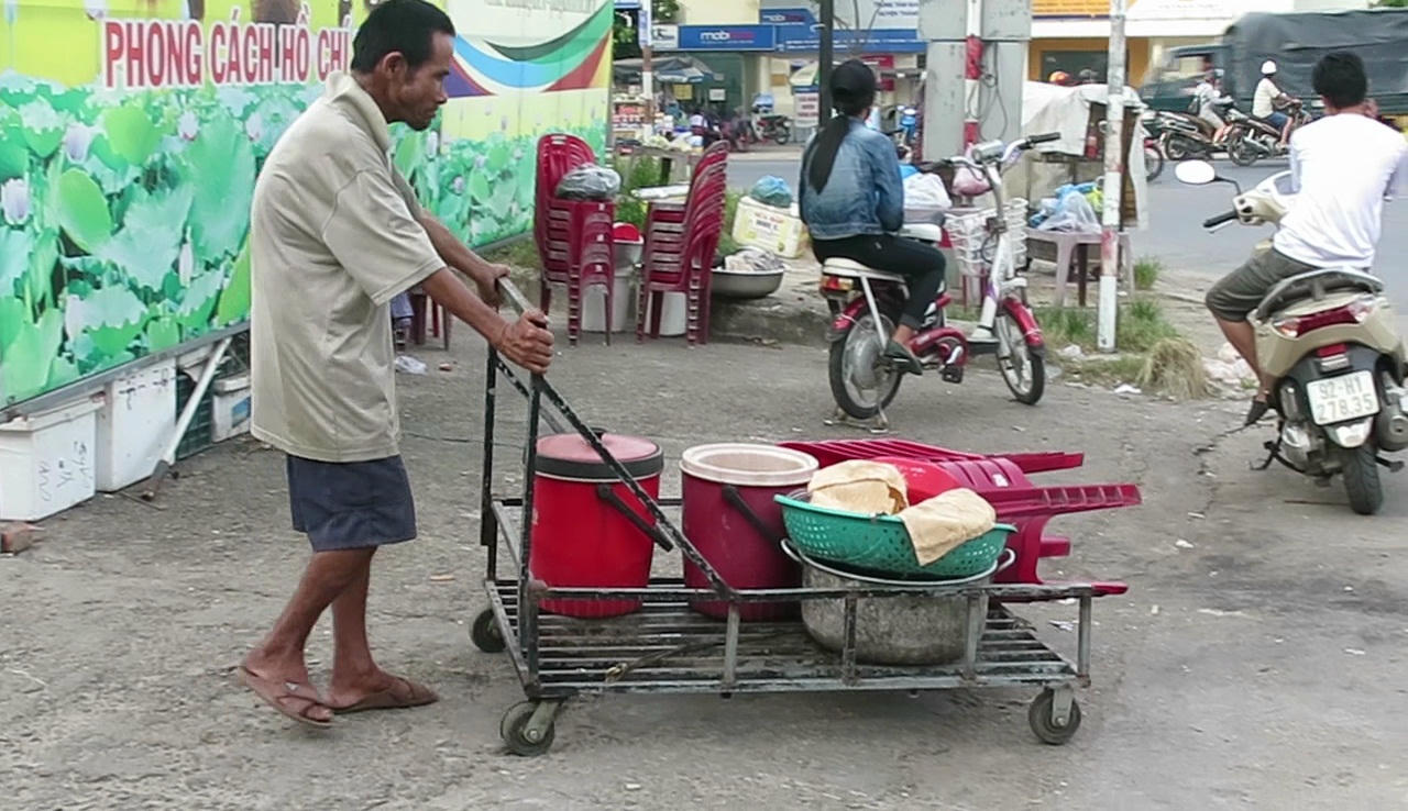 Cứ tầm 15h, ông khuân vác bình nước, bàn ghế, nồi xoong… cho các hộ kinh doanh ăn uống, giải khát. Hết hộ này đến hộ khác, hết dọn hàng ra rồi dọn hàng vào, ông cần mẫn làm việc đến tận khuya. Các hộ kinh doanh - người trả ông 10 ngàn, người trả ông 20 ngàn. Trả bao nhiêu ông nhận bấy nhiêu, không kêu ca cũng không chểnh mảng công việc của mình. Thỉnh thoảng những người qua đường tốt bụng biếu ông đồng quà, tấm bánh.