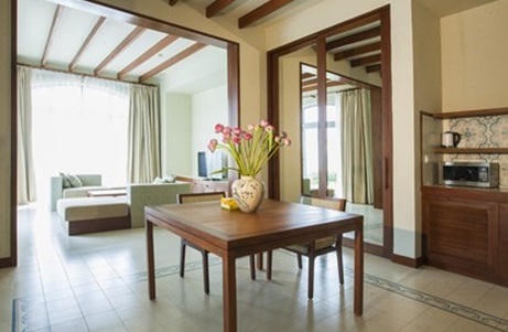 Khu vực phòng sinh hoạt chung gồm phòng khách, khu bếp và phòng ăn được thiết kế liên thông, với tầm nhìn không bị giới hạn bởi không gian bể bơi, thảm cỏ và bãi biển tạo cảm giác thoáng đạt. Đặc biệt, toàn bộ tường phía ngoài được chủ đầu tư sử dụng kính cách âm, giúp căn phòng luôn tràn ngập ánh sáng, nhưng vẫn luôn yên tĩnh trước sóng biển