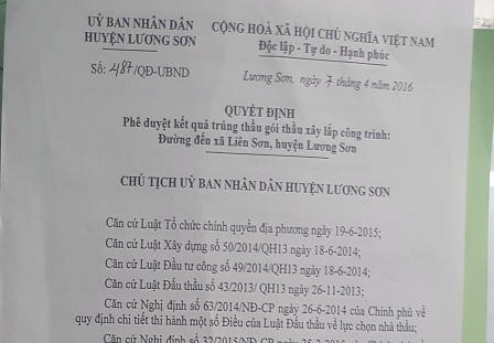 Quá trình chấm thầu thực hiện đến ngày 07/04/2016, ông Nguyễn Vũ Chi – Chủ tịch UBND huyện Lương Sơn đã ra quyết định số 487/QĐ-UBND về việc phê duyệt kết quả trúng thầu gói thầu xây lắp công trình: Đường đến xã Liên Sơn, huyện Lương Sơn đối với nhà thầu là Công ty TNHH xây dựng và trang trí nội thất Việt Hà, giá trúng thầu là 9,515 tỷ đồng, thời gian thực hiện là 300 ngày kể từ ngày hợp đồng kinh tế có hiệu lực.