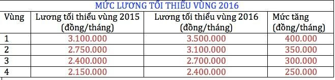 Cụ thể, lương tối thiểu vùng 1 năm 2016 sẽ tăng 400.000 đồng, vùng 2 là 350.000 đồng, vùng 3 là 300.000 đồng và vùng 4 là 250.000 đồng. Mức điều chỉnh này sẽ có hiệu lực từ ngày 1/1/2016.