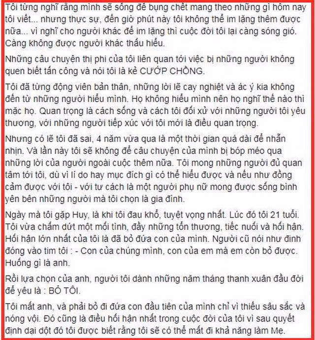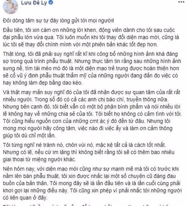 “Tôi từng nghĩ mình sống để bụng chết mang theo những gì hôm nay tôi viết, nhưng thực sự, đến giờ phút này tôi không thể im lặng thêm được nữa. Vì nghĩ cho người khác để im lặng thì cuộc đời tôi lại càng sóng gió. Càng không được người khác thấu hiểu. Những câu chuyện thị phi của tôi liên quan tới việc bị những người không quen biết tấn công và nói tôi là kẻ cướp chồng”, Lưu Đê Ly viết.