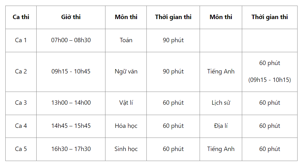Lịch thi diễn ra vào thứ 7, ngày 6/5. Giờ thi chính thức theo ca như sau: