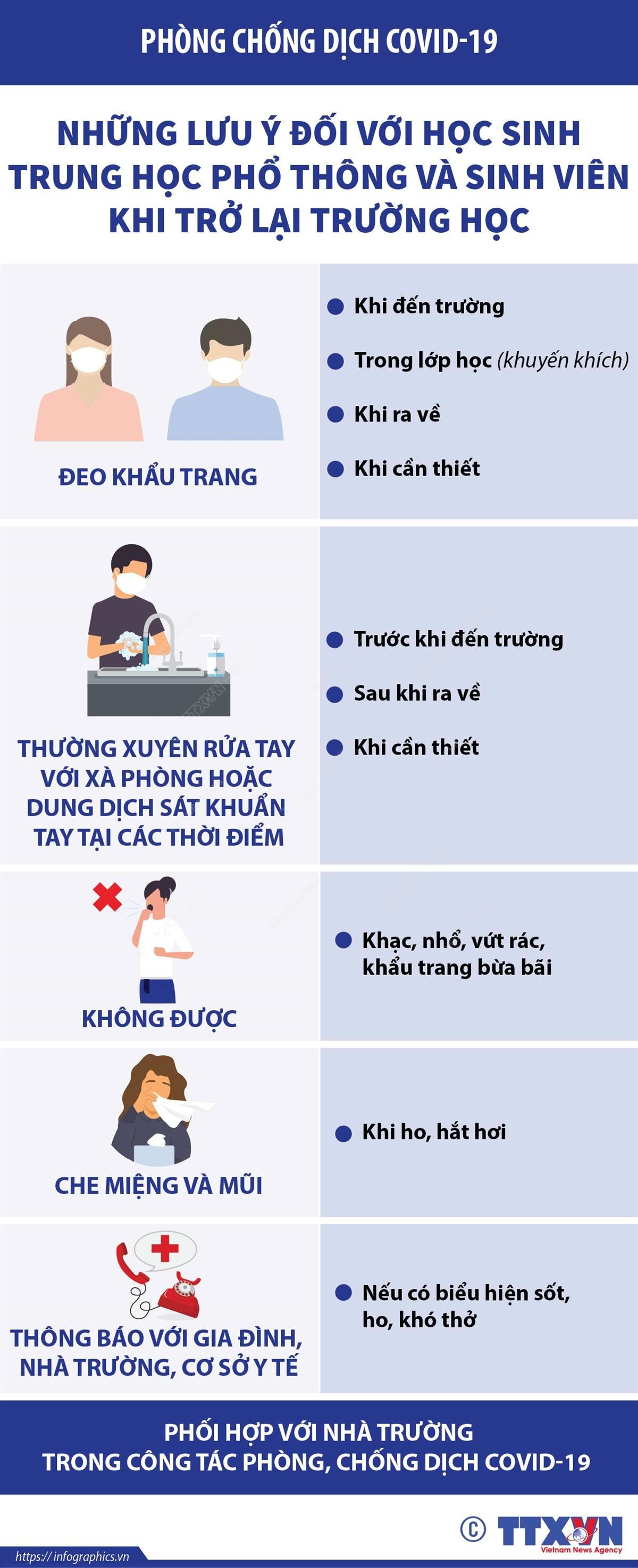Học sinh Trung học phổ thông và sinh viên khi trở lại trường học cần đeo khẩu trang khi đến trường, trong lớp học (khuyến khích), khi ra về, khi cần thiết thường xuyên rửa tay với xà phòng hoặc dung dịch sát khuẩn tay; thông báo với gia đình, nhà trường, cơ sở y tế nếu có biểu hiện sốt, ho, khó thở...