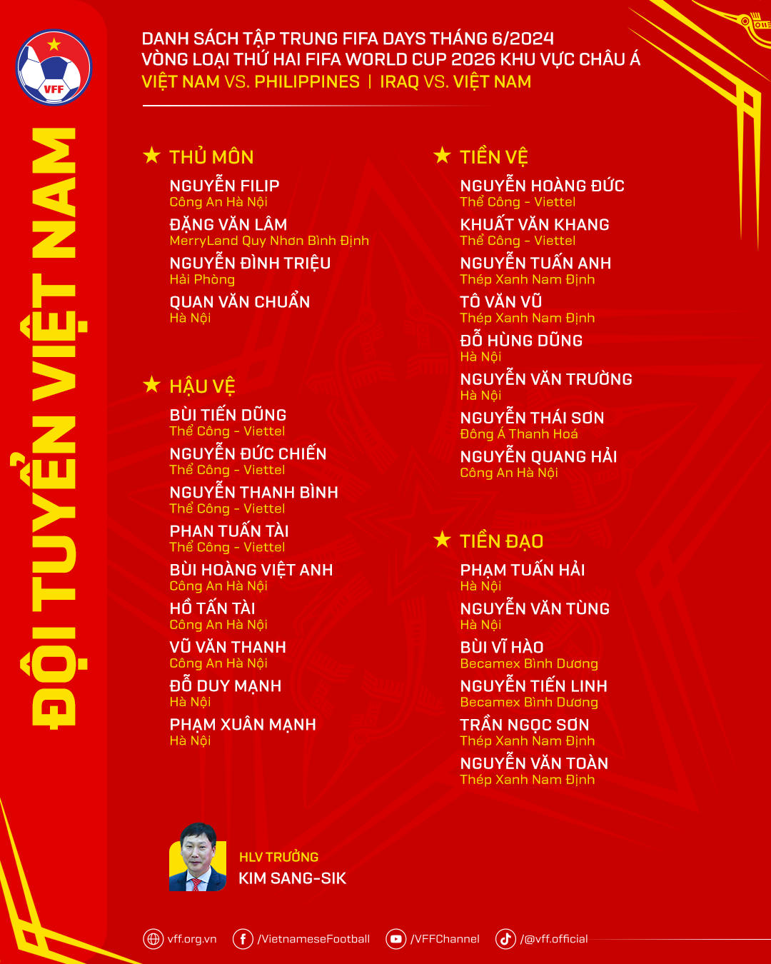 Theo kế hoạch, đội tuyển Việt Nam sẽ bắt đầu hội quân tập luyện vào ngày 1/6 tới. Thầy trò HLV Kim Sang Sik có quỹ thời gian 5 ngày để chuẩn bị cho cuộc tiếp đón đội tuyển Philippines trên sân nhà, diễn ra vào 19h00 ngày 6/6 trước khi di chuyển sang Iraq để thi đấu trận cuối cùng tại Vòng loại thứ hai World Cup 2026 khu vực châu Á.